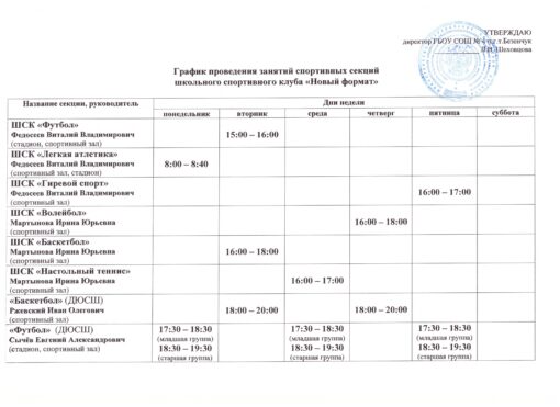 Расписание работы спортивных секций в ШСК
