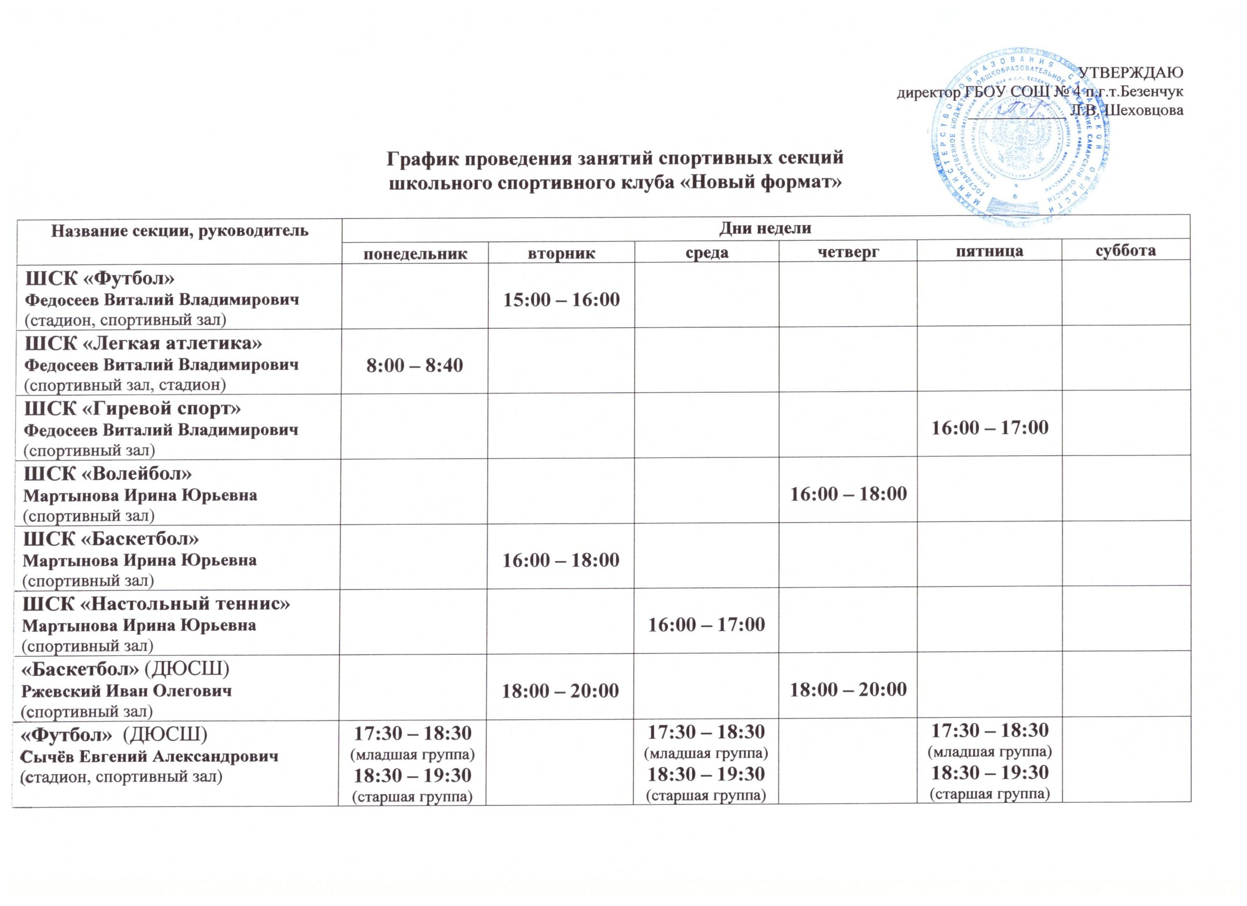 Расписание работы спортивных секций в ШСК