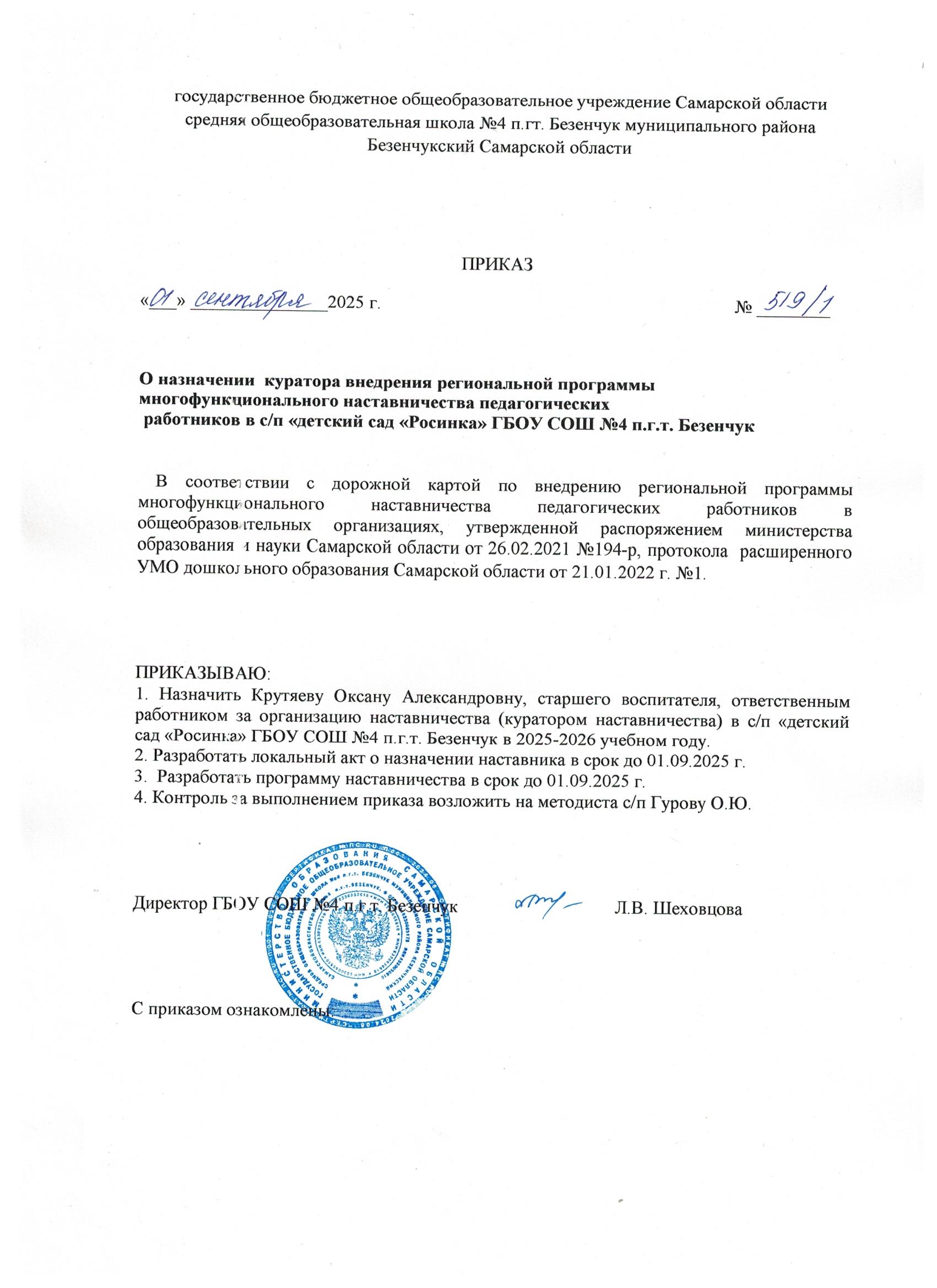 Приказ от 01.09.2025 № 519/1-од «О назначении куратора внедрения региональной программы многофункционального наставничества педагогических работников в с/п «детский сад «Росинка»
