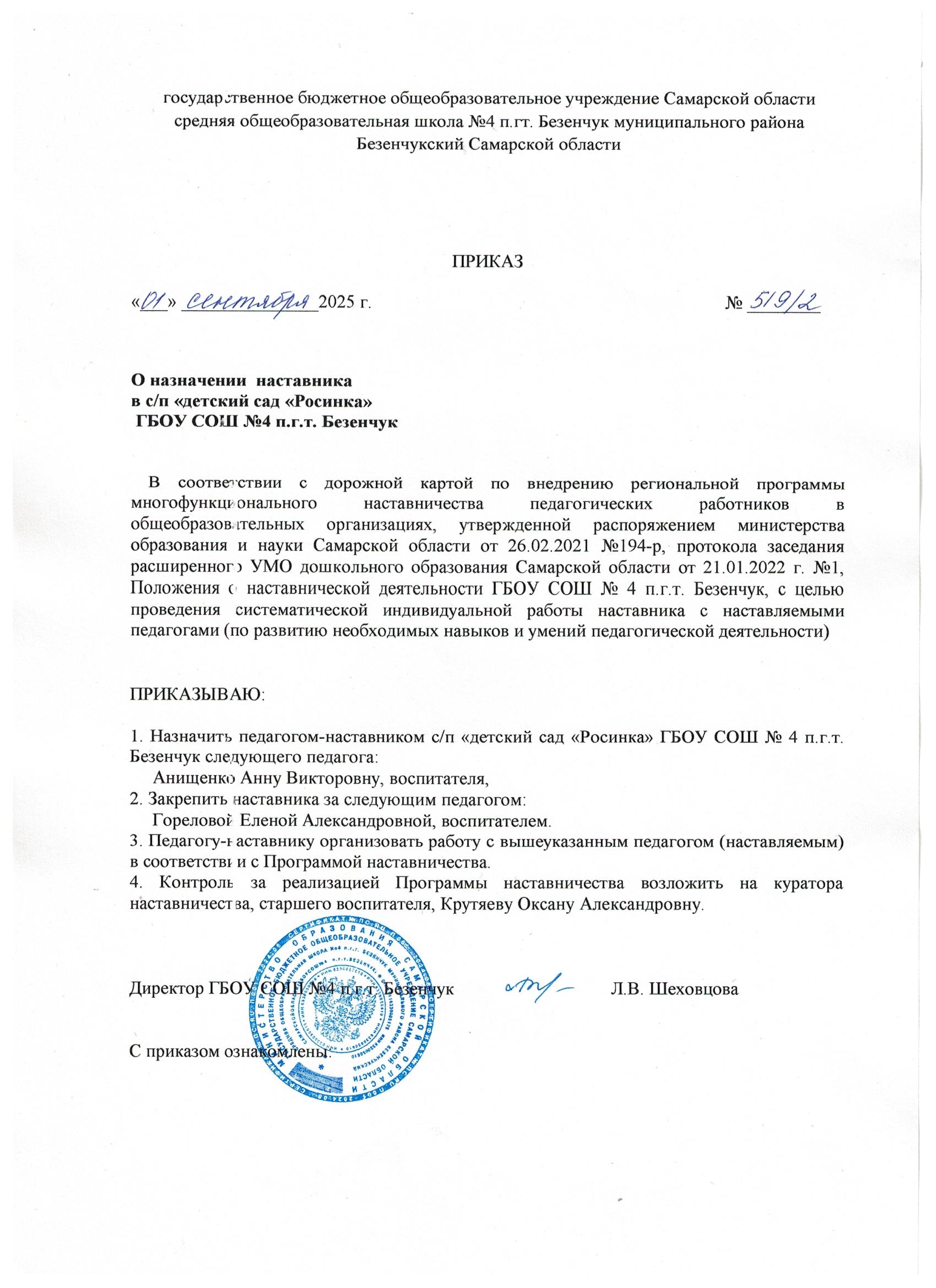 Приказ от 01.09.2025 № 519/2-од «О назначении наставника в с/п «детский сад «Росинка»